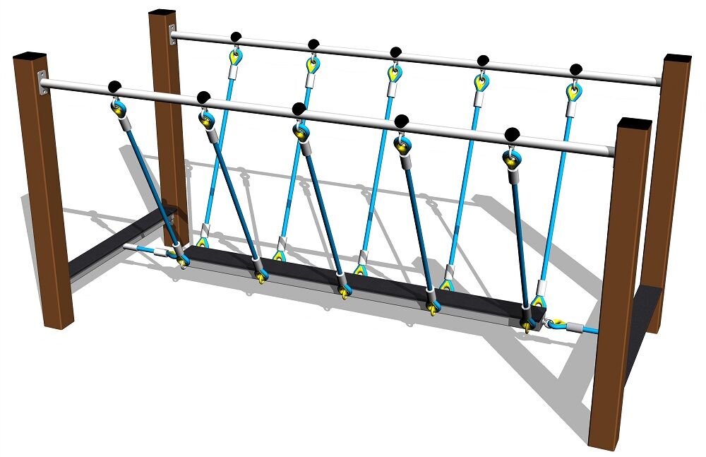 Lanová lávka se zavěšeným trámem - celokovová, délka 2 m, výška pádu 1 m, jako dopadová plocha postačí trávník. Na výběr jsou dvě barevné varianty konstrukce - hnědá a stříbrná. Více informací