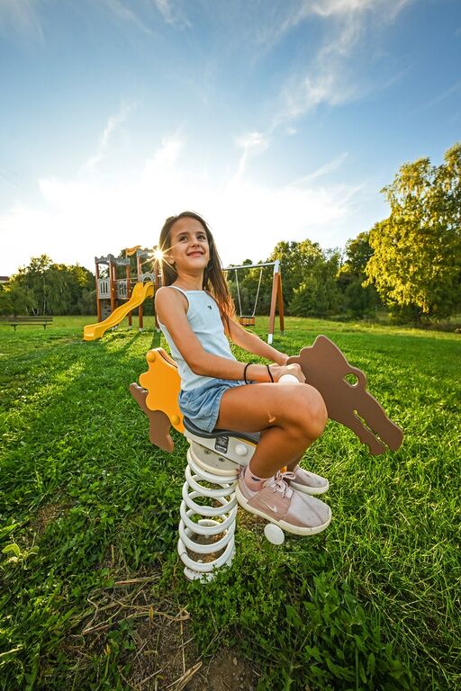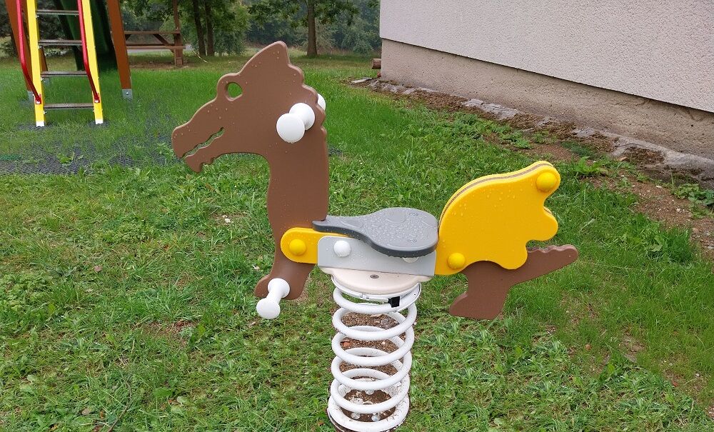 Oblíbené dětské pružinové houpadlo - DRAK. Výška pádu do 1 m, jako dopadová plocha postačí trávník. Více informací