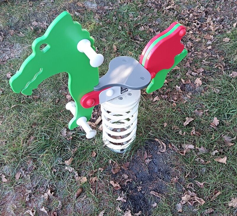 Oblíbené dětské pružinové houpadlo - DRAK. Výška pádu do 1 m, jako dopadová plocha postačí trávník. Více informací