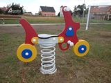 Houpadlo na pružině - MOTORKA. Výška pádu do 1 m, jako dopadová plocha postačí trávník. Nabízíme modrou a červenou variantu. Více informací