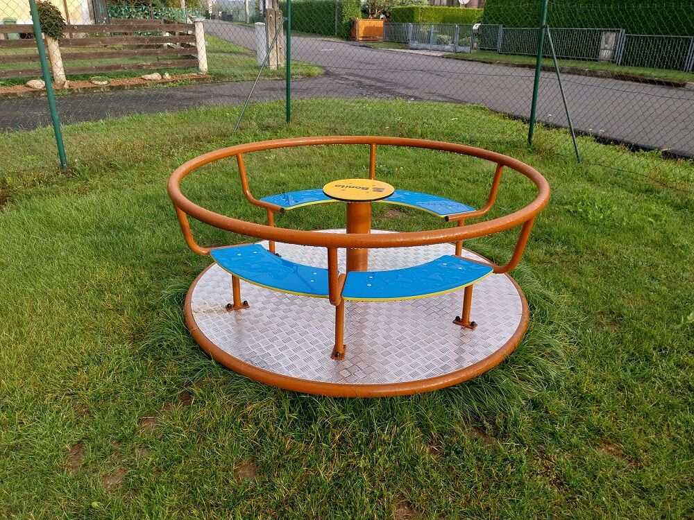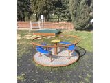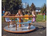 Kolotoč na sezení KO180K (průměr 1,8 m) - celokovový s protiskluzovou podlahou, otočným středem a sedáky z HDPE. Výška pádu do 1 m, jako dopadová plocha postačí trávník. Více informací