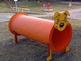 Pejsek PP021K - celokovový - 1x prolézací tunel (1,9 m), který je vyroben z laminátu a je UV stabilní což zaručuje vysokou barevnou stálost. Výška pádu do 1 m, jako dopadová plocha postačí trávník. Více informací