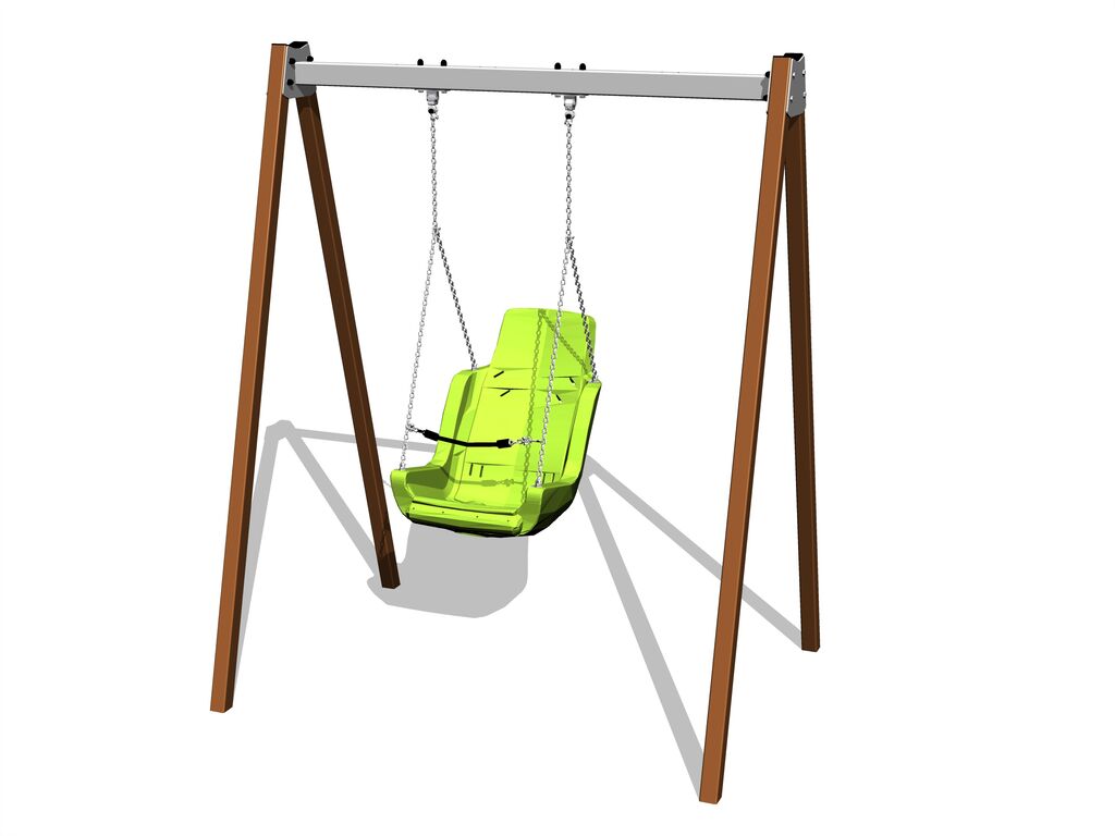 Sedátko inkluziv je vyrobeno z HDPE s vložkou tlumící nárazy. Houpačka je zavěšena pomocí nerezových řetězů na kovovém nosníku. Veškerý spojovací materiál je pozinkovaný nebo nerezový.