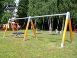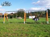 Sedátko a houpačkové závěsy nejsou součástí houpačky. Nutné přikoupit sedátko (2 ks) dle výběru a houpačkové závěsy (4 ks). Řetězová trojhoupačka RH320D - s kovovým, pozinkovaným ráhnem, výška pádu 1 m, jako dopadová plocha postačí trávník, 1x „Hnízdo“ (průměr 1 m). Více informací