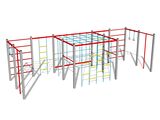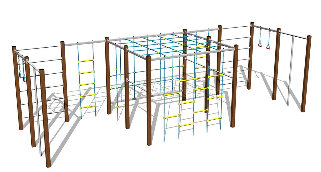 2x šplhací lano, 2x šplhací tyč, šplhací síť, lanový žebřík, žebřiny, ručkovací síť, lezecká stěna.