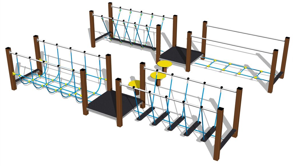 Lanová lávka, lanová lávka s nášlapy, lanová lávka se zavěšeným trámem, lanová lávka se sítí, 2x podesta, 3x step. Na výběr jsou dvě barevné varianty konstrukce - hnědá a stříbrná. Více informací