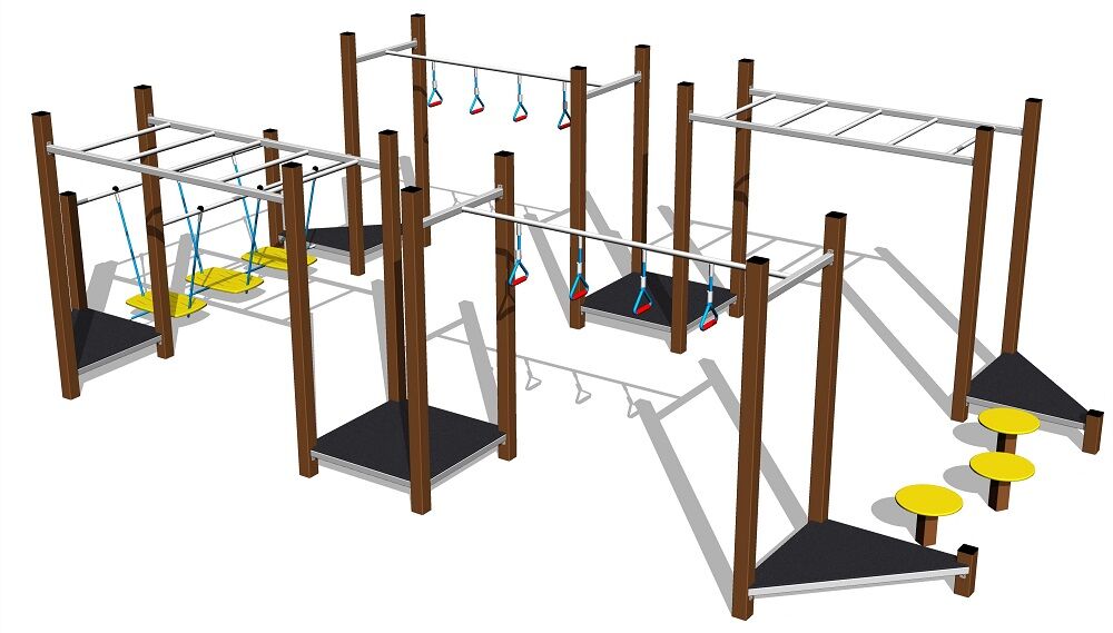 Lanová lávka s nášlapy, 6x podesta, 3x step, 2x ručkovadlo, 8x lanové kruhy. Na výběr jsou dvě barevné varianty konstrukce - hnědá a stříbrná. Více informací