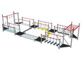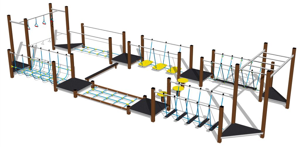 Lanová lávka, lanová lávka s nášlapy, lanová lávka se zavěšeným trámem, lanová lávka s plastovými nášlapy, lanová lávka se sítí, síť, kladina, 8x podesta, 3x step, ručkovadlo, 4x lanové kruhy. Na výběr jsou dvě barevné varianty konstrukce - hnědá a stříbrná. Více informací