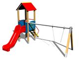 Sedátko a houpačkové závěsy nejsou součástí houpačky. Nutné přikoupit sedátko (1 ks) dle výběru a houpačkové závěsy (2 ks). Věž, skluzavka, stříška ve tvaru "A", 2x bariéra, šikmý výlez s nášlapy a kovovými madly, kovové ráhno. Více informací