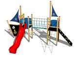 2x věž, skluzavka, kovová bariéra osazená do dřevěného rámu, 2x stožár s vlajkou, šikmý výlez s lanem a nášlapy z HDPE, lanový most mezi věžemi, šikmý síťový výlez, kreslící tabule, kotva, kormidlo z HDPE, 2x bariéra z HDPE. Více informací