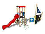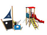 Věž, skluzavka, stříška ve tvaru obloukovém, bariéra, šikmý síťový výlez, šikmý výlez s nášlapy a kovovými madly, 2x bariéra s průzorem, 2x lavice, kormidlo, kotva, stožár s vlajkou, kreslicí tabule. Více informací