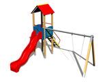 Sedátko a houpačkové závěsy nejsou součástí houpačky. Nutné přikoupit sedátko (1 ks) dle výběru a houpačkové závěsy (2 ks). Věž, skluzavka, stříška ve tvaru "A", 2x bariéra, šikmý výlez s nášlapy a kovovými madly, kovové ráhno. Více informací