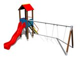 Sedátko a houpačkové závěsy nejsou součástí houpačky. Nutné přikoupit sedátko (2 ks) dle výběru a houpačkové závěsy (4 ks). Věž, skluzavka, stříška ve tvaru "A", 2x bariéra, šikmý výlez s nášlapy a kovovými madly, kovové ráhno. Více informací
