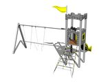 Sedátko a houpačkové závěsy nejsou součástí houpačky. Nutné přikoupit sedátko (2 ks) dle výběru a houpačkové závěsy (4 ks). Věž, skluzavka, 2x bariéra z HDPE, šikmý síťový výlez, vlajka, cimbuří z HDPE, kovové ráhno. Více informací
