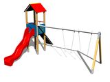 Sedátko a houpačkové závěsy nejsou součástí houpačky. Nutné přikoupit sedátko (2 ks) dle výběru a houpačkové závěsy (4 ks). Věž, skluzavka, stříška ve tvaru "A", 2x bariéra, šikmý výlez s lanem a nášlapy, řetězová dvojhoupačka s kovovým ráhnem. Více informací