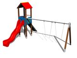 Sedátko a houpačkové závěsy nejsou součástí houpačky. Nutné přikoupit sedátko (2 ks) dle výběru a houpačkové závěsy (4 ks). Věž, skluzavka, stříška ve tvaru "A", 2x bariéra, šikmý výlez s lanem a nášlapy, řetězová dvojhoupačka s kovovým ráhnem. Více informací