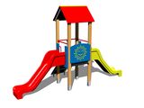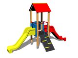Věž, stříška ve tvaru "A", 2x skluzavka, bariéra, šikmý výlez s lanem a nášlapy. Více informací