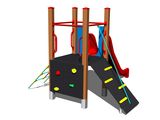 Věž, skluzavka, šikmý výlez s lanem a nášlapy z HDPE, šikmý síťový výlez, kolmá lezecká stěna na věži. Více informací