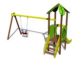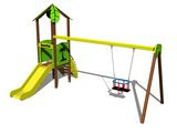 Věž, skluzavka, stříška ve tvaru listu, šikmý výlez s nášlapy a madly z HDPE, 2x bariéra, kovový nosník, sedátko Baby. Více informací
