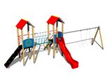Sedátko a houpačkové závěsy nejsou součástí houpačky. Nutné přikoupit sedátko (2 ks) dle výběru a houpačkové závěsy (4 ks). 2x věž, skluzavka, 2x stříška ve tvaru "A", 2x bariéra z HDPE, šikmý výlez s nášlapy a kovovými madly, šikmý žebříkový výstup s kovovými nášlapy, lanový most mezi věžemi, šikmá lezecká stěna, kovové ráhno. Více informací