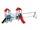 2x věž, skluzavka, 2x stříška ve tvaru "A", 2x Sedátko a houpačkové závěsy nejsou součástí houpačky. Nutné přikoupit sedátko (2 ks) dle výběru a houpačkové závěsy (4 ks). bariéra z HDPE, šikmý výlez s nášlapy a kovovými madly, šikmý žebříkový výstup s kovovými nášlapy, lanový most mezi věžemi, šikmá lezecká stěna, kovové ráhno. Více informací