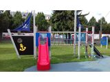 2x věž, skluzavka, kovová bariéra osazená do kovového rámu, 2x stožár s vlajkou, šikmý výlez s lanem a nášlapy z HDPE, lanový most mezi věžemi, šikmý síťový výlez, kreslící tabule, kotva, kormidlo z HDPE, 2x bariéra z HDPE. Více informací