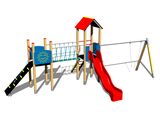 Sedátko a houpačkové závěsy nejsou součástí houpačky. Nutné přikoupit sedátko (1 ks) dle výběru a houpačkové závěsy (2 ks). 2x věž, skluzavka, stříška ve tvaru "A", 3x bariéra z HDPE, šikmý žebříkový výstup s kovovými nášlapy, lanový most mezi věžemi, šikmý výlez s lanem a nášlapy z HDPE, kovové ráhno. Více informací