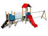 Sedátko a houpačkové závěsy nejsou součástí houpačky. Nutné přikoupit sedátko (1 ks) dle výběru a houpačkové závěsy (2 ks). 2x věž, skluzavka, stříška ve tvaru "A", 3x bariéra z HDPE, šikmý žebříkový výstup s kovovými nášlapy, lanový most mezi věžemi, šikmý výlez s lanem a nášlapy z HDPE, kovové ráhno. Více informací