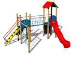 2x věž, skluzavka, stříška ve tvaru "A", šikmý výlez s nášlapy a kovovými madly, kolmá lezecká stěna na věži, šikmý výlez s lanem a nášlapy z HDPE, lanový most mezi věžemi, šplhací síť 2 x 2 m, 2x bariéra z HDPE . Více informací