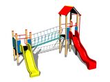 2x věž, 2x skluzavka, stříška ve tvaru "A", bariéra z HDPE, požární tyč, šikmý síťový výlez, šikmý výlez s lanem a nášlapy z HDPE, šikmý lanový most mezi věžemi. Více informací