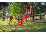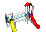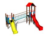 2x věž, 2x skluzavka, stříška ve tvaru "A", bariéra z HDPE, požární tyč, šikmý síťový výlez, šikmý výlez s lanem a nášlapy z HDPE, šikmý lanový most mezi věžemi. Více informací