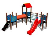 3x věž, skluzavka, stříška ve tvaru "A", 5x bariéra z HDPE, kolmý žebřík, šikmá lezecká stěna, lanový most mezi věžemi, prolézací tunel mezi věžemi. Více informací