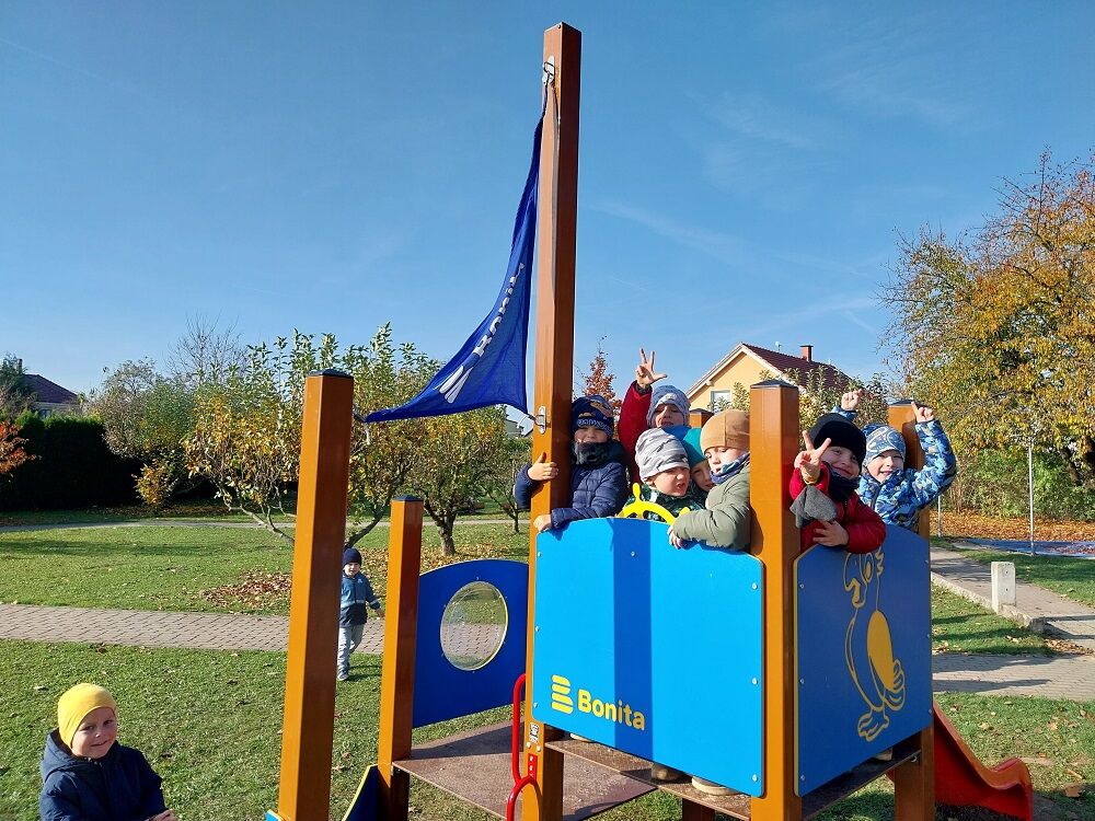 3x věž, skluzavka, 2x bariéra s kruhem, bariéra s papouškem, bariéra s průzorem, příď s kotvou a vlnou, kormidlo, stožár s vlajkou. Více informací