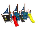 5x věž, 2x skluzavka, kovová bariéra osazené do kovového rámu, 3x stožár s vlajkou, kreslící tabule, šikmý výlez s lanem a nášlapy z HDPE, šikmý síťový výlez, šikmá lezecká stěna, šikmý žebříkový výstup s kovovými nášlapy, kolmý žebřík, 4x bariéra s průzorem, kotva, kormidlo z HDPE, 4x bariéra z HDPE. Více informací