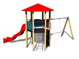 Sedátko a houpačkové závěsy nejsou součástí houpačky. Nutné přikoupit sedátko (1 ks) dle výběru a houpačkové závěsy (2 ks). Věž, skluzavka, stříška, kolmý žebřík, 3x bariéra, kovové ráhno, kolmá lezecká stěna na věži. Více informací