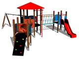 Sedátko a houpačkové závěsy nejsou součástí houpačky. Nutné přikoupit sedátko (1 ks) dle výběru a houpačkové závěsy (2 ks). 2x čtyřboká věž, šestiboká věž, skluzavka, stříška, kolmý žebřík, šikmá lezecká stěna, lanový most mezi věžemi, prolézací tunel mezi věžemi, kovové ráhno, požární tyč, 6x bariéra z HDPE. Více informací